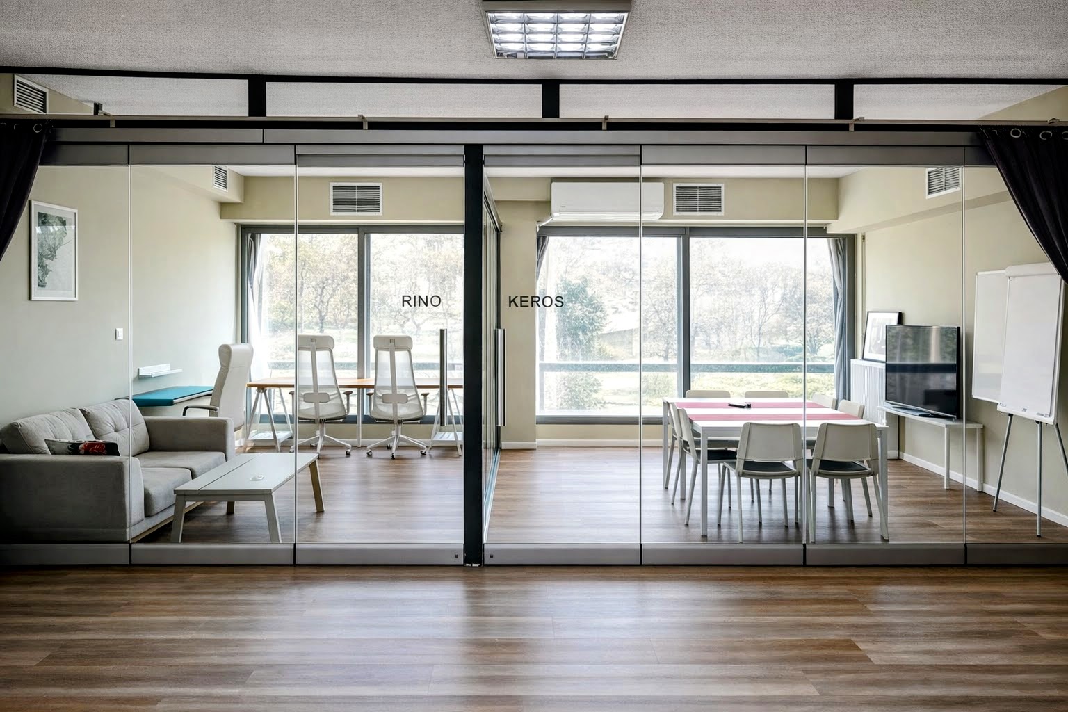 Our rooms are: Rhino (30m2), Keros (120 m2), Rinokeros (150 m2). All spaces include additional use of our balcony (40 m2) and all our other infrastructure. Any other equipment or facilities you may need, can be provided upon request.